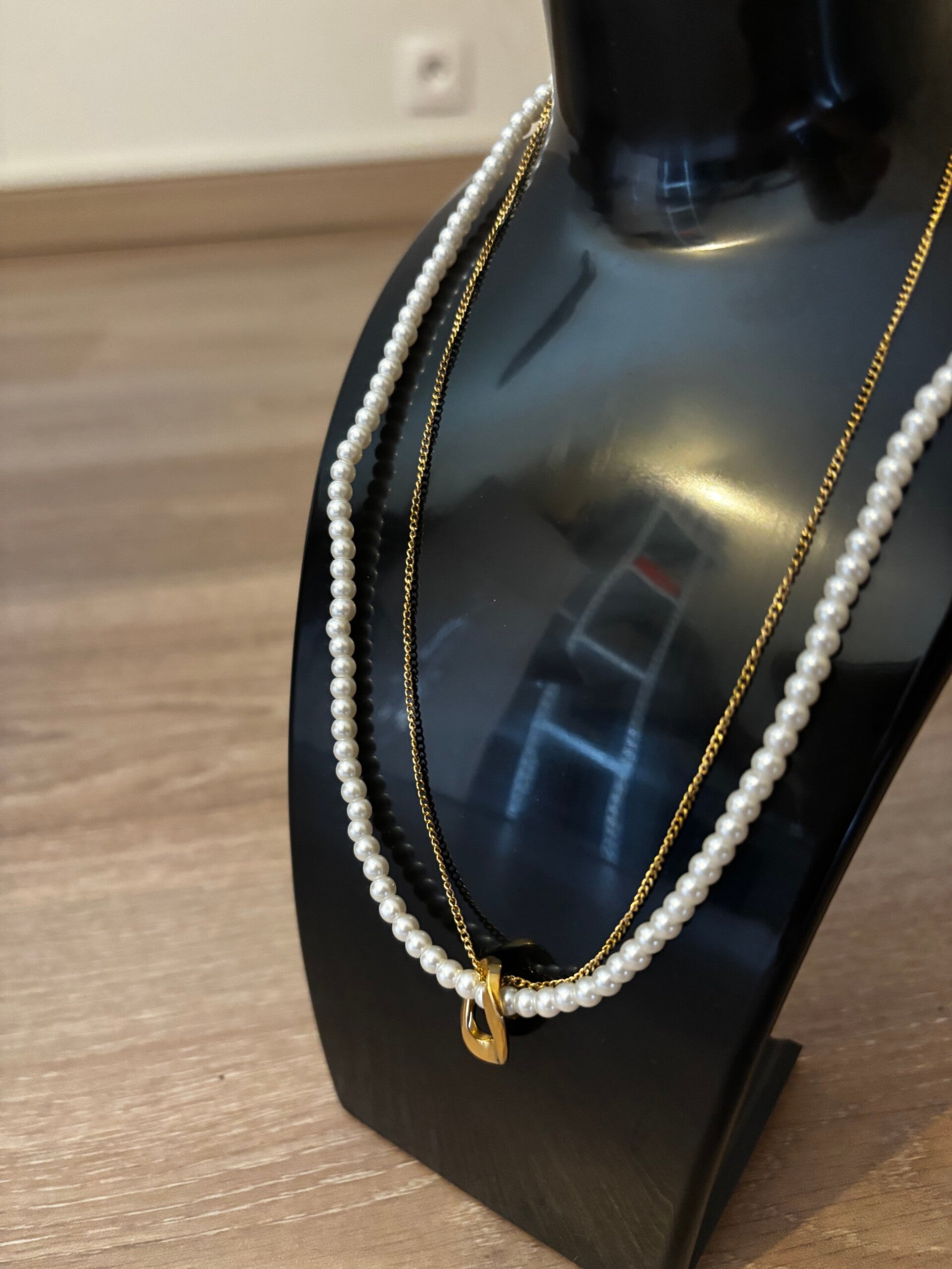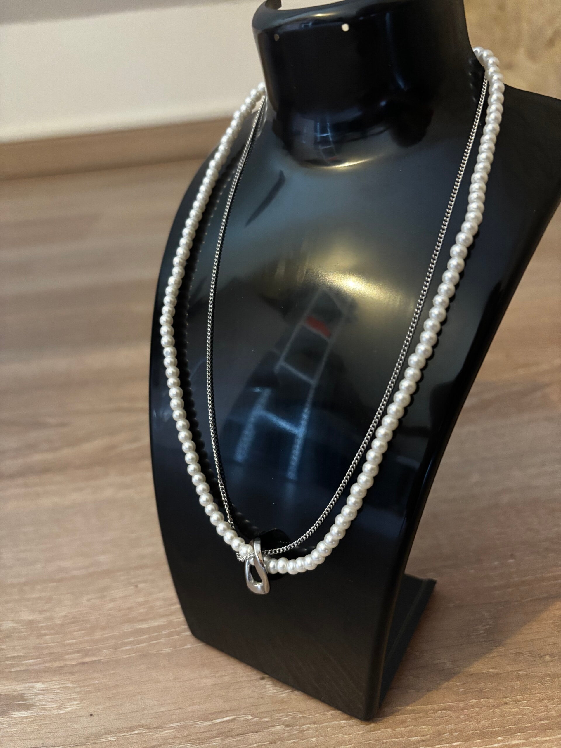 Collier perle en double qui ne forme qu'un à l'arrivée du pendentif. Parfait pour la vie de tout les jours avec sa brillance exceptionnelle. Ne terni pas dans le temps. Résiste à l'eau. Fabriquer en acier inoxydable.