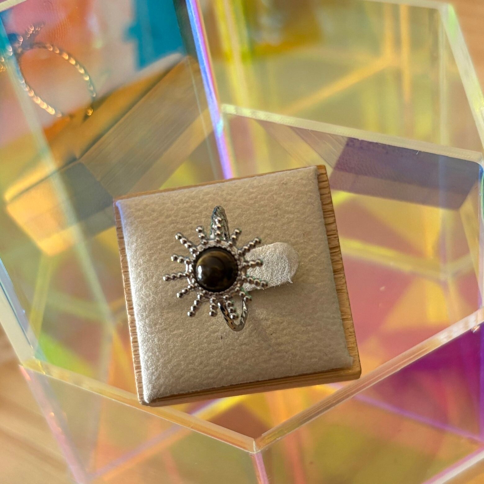 Bague soleil,avec sa touche de couleur marron. Parfait pour le printemps. Ne terni pas dans le temps. Résiste à l'eau. Bijoux en acier inoxydable
