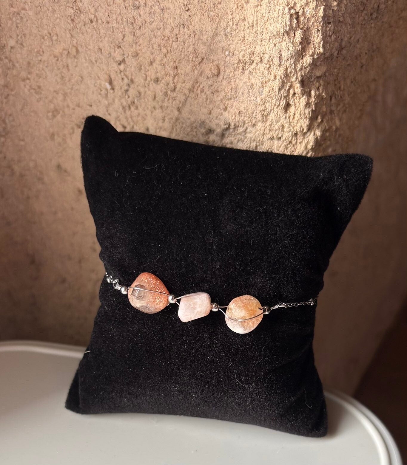 Bracelet avec de belle pierre avec une touche de rose beige et marron clair à la fois. Ne terni pas dans le temps. Résistant à l'eau. Fabriquer en acier inoxydable