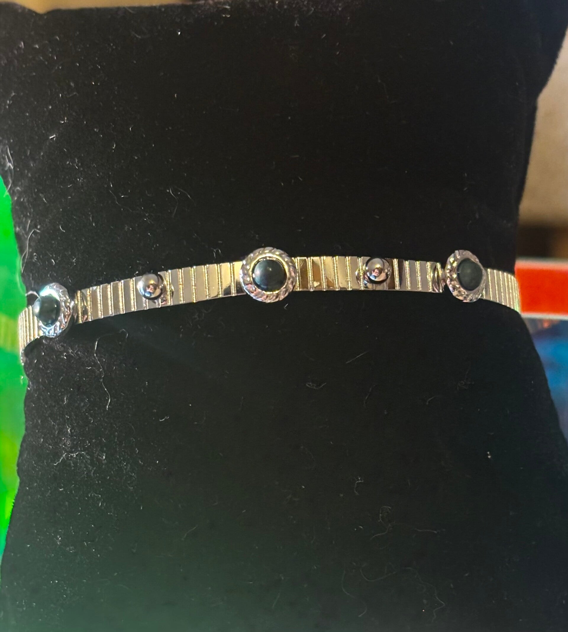 Bracelet jonc avec des petit pierre verte.magnifique à porter toute le temps. De très bonne qualité en acier inoxydable résistant à l'eau. Ne terni pas dans le temps .