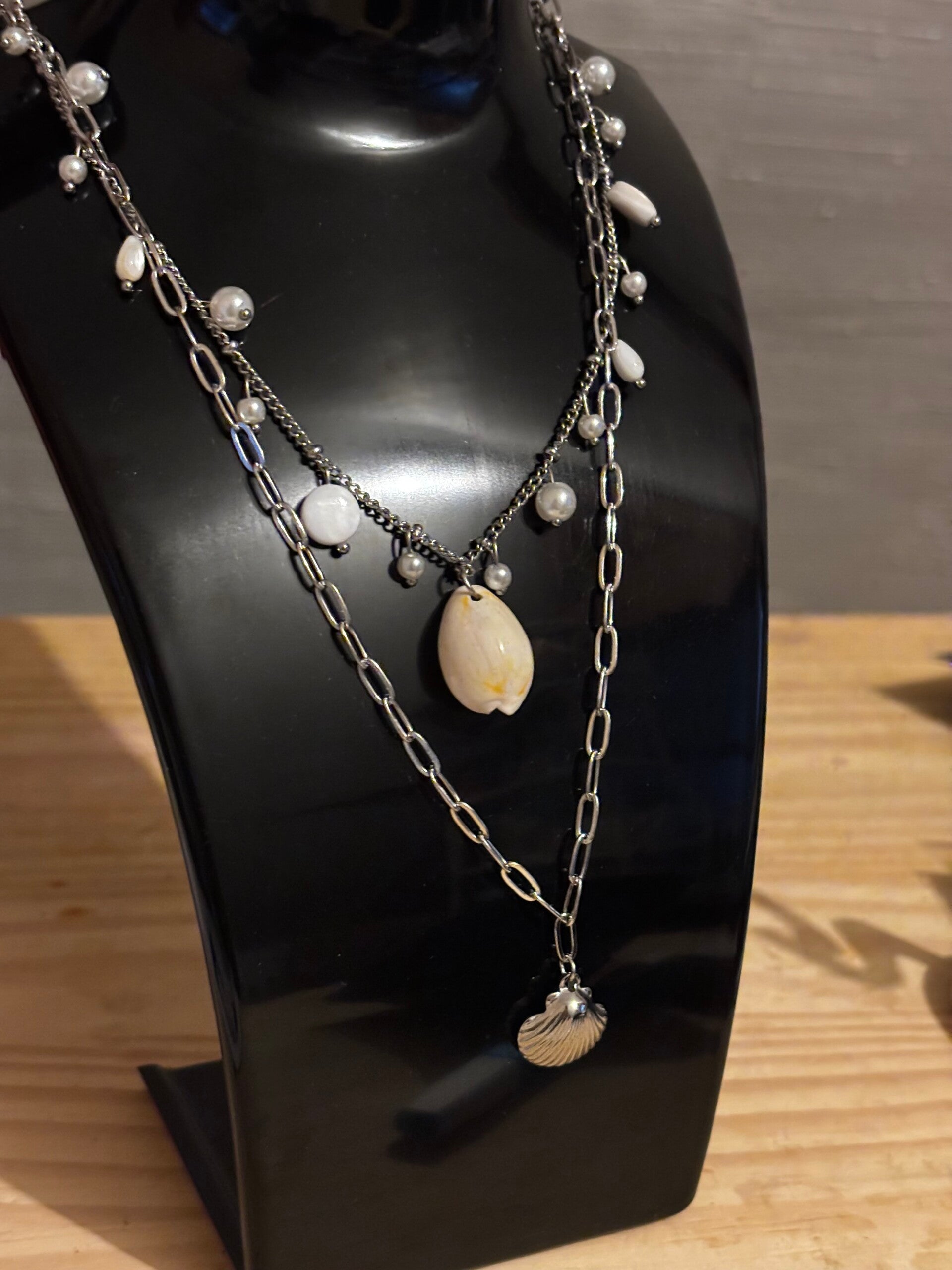 Collier breloque double. Des petite perle et un beau coquillage au milieu qui donne tout son charme. Fabriquer en acier inoxydable. Résiste à l'eau. Ne terni pas dans le temps