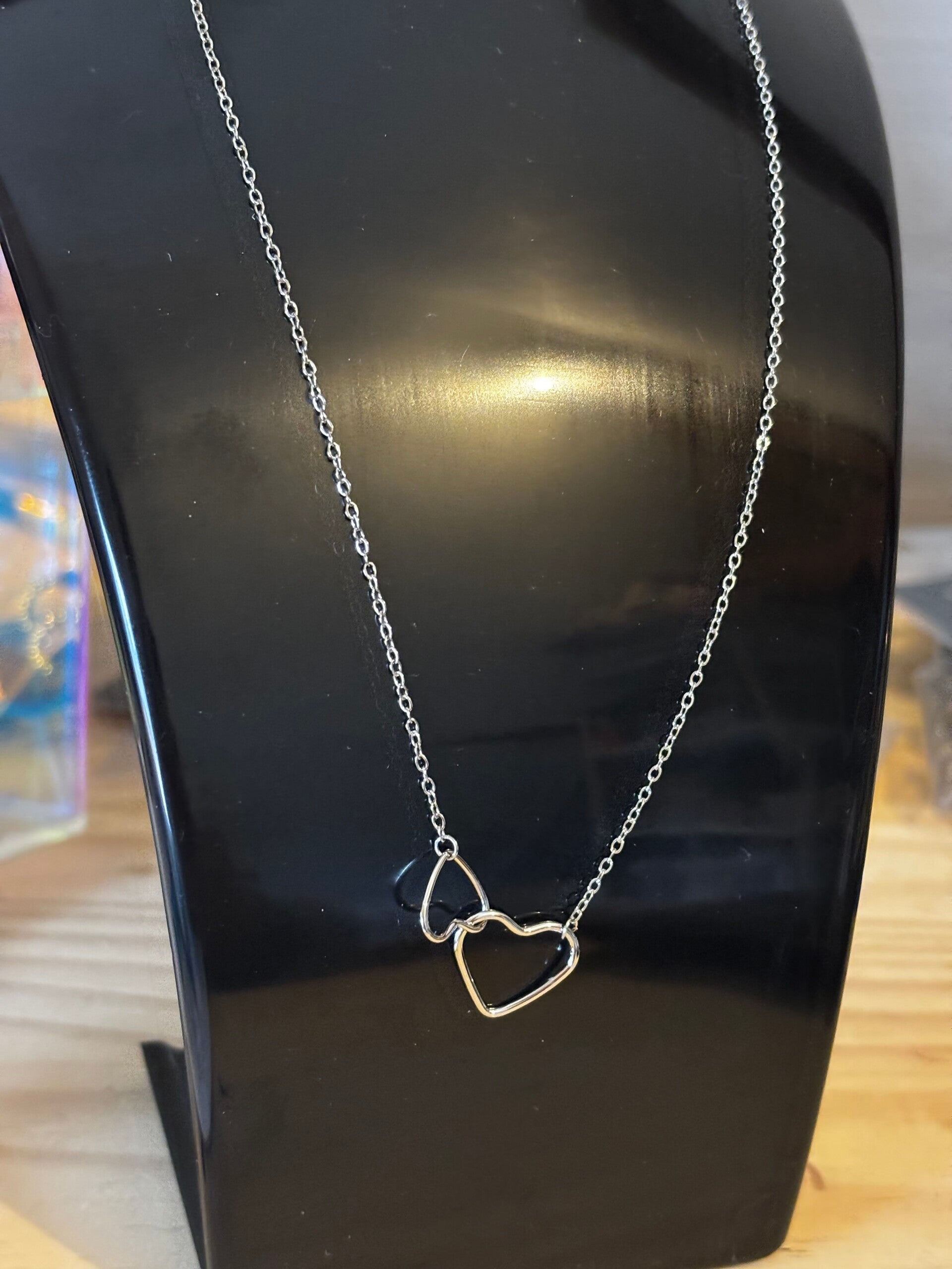 Magnifique collier cœur avec les cœur qui se superposent. Fabriquer en acier inoxydable. Résiste à l'eau. Ne terni pas dans le temps