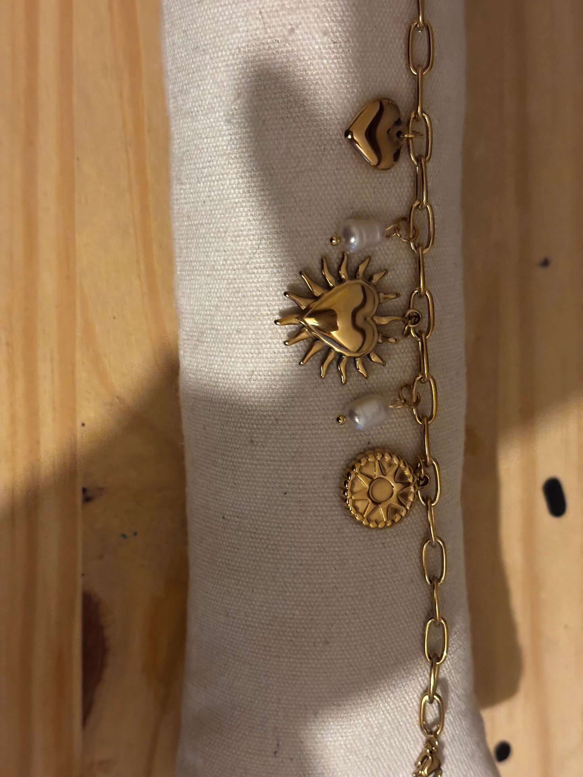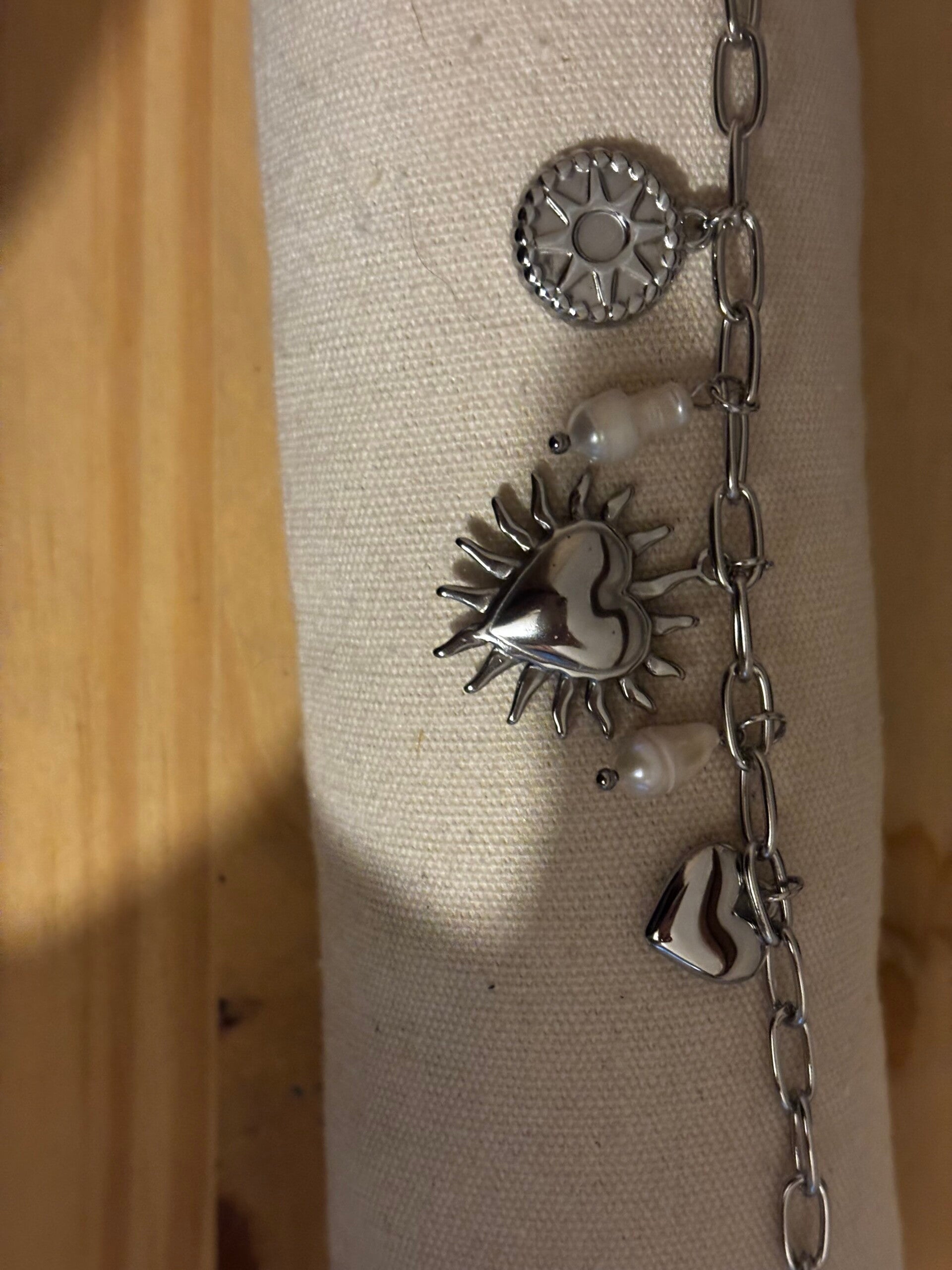 Magnifique bracelet breloque avec le soleil cœur central. Fabriquer en acier inoxydable. Résiste à l'eau. Ne terni pas dans le temps