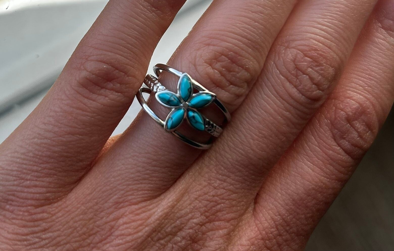 Magnifique bague fleur avec plusieurs couleur sur chaque une petite touche de gris que fait un style incroyable fabriquer en acier inoxydable ajustable à votre tour de doigts. Ne terni pas dans le temps. Résiste à l'eau